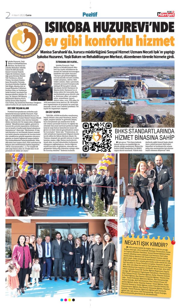 Manisa Saruhanlı’da, kurucu müdürlüğünü Sosyal Hizmet Uzmanı Necati Işık’ın yaptığı Işıkoba Huzurevi, Yaşlı Bakım ve Rehabilitasyon Merkezi, düzenlenen törenle hizmete girdi.